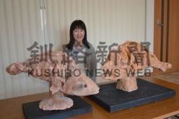 [写真/受賞作品「回游まき」「同Ⅱ」と石橋さん ]