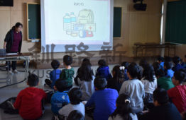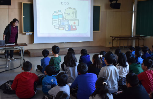 [写真/㊤防災士の立塚さんが防災講話を行った津波避難訓練(釧路市立武佐小学校) ]