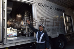[写真/公開されたガスタービンで発電する高圧移動発電機車 ]