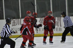 [写真/㊤【釧鳥取―釧景雲】第1ピリオド4分、波状攻撃で先制点を挙げ、笑顔を見せる釧鳥取の八巻(右から2人目)㊦【遠矢・別保・標茶―釧路合同】全道切符を獲得し、喜びを分かち合う遠矢・別保・標茶 ]