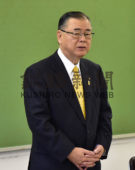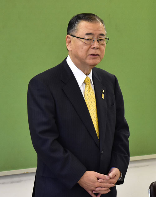 [写真/編成作業スタートに職員へ編成方針を示す石垣市長 ]