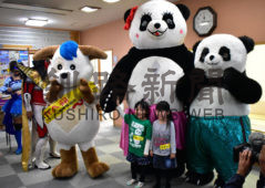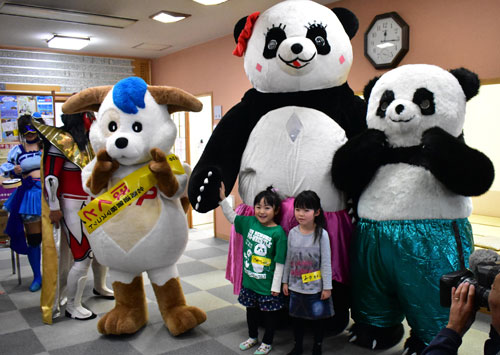 [写真/特別参加の新根室プロレスメンバー。配膳の手伝いから写真撮影と大忙し。大人から子供まで大人気だった ]