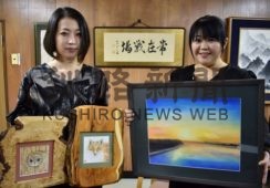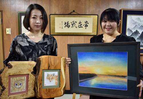 [写真/展示する作品を手に小泉さん(右)と野澤さん ]