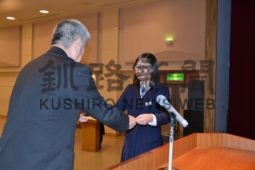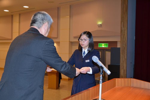 [写真/辻川教育長(左)から賞状を受ける大場心さん ]