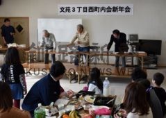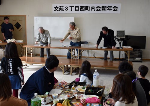 [写真/大豆の橋渡しゲームで盛り上がった新年会(文苑3丁目西町内会) ]