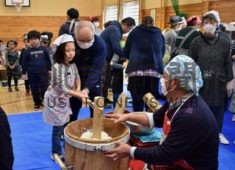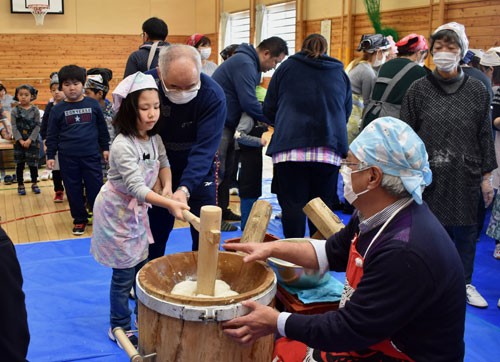 [写真/児童と地域住民、父母らが交流した餅つき会 ]