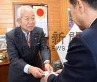 [写真/寄付金を手渡す正岡理事長(中央) ]
