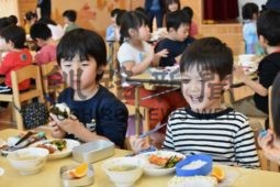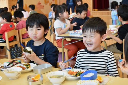 [写真/地元産のタラ料理を楽しむ園児 ]