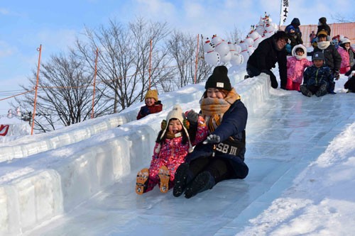 [写真/少雪で縮小されても親子連れに大人気となった滑り台 ]