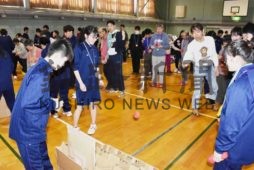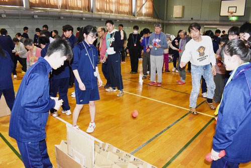 [写真/歯舞中の生徒考案のゲームを楽しむ園生ら ]