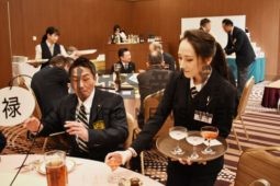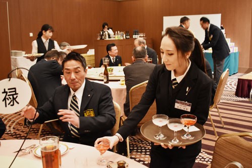 [写真/各テーブルに色鮮やかなカクテルが運ばれた新春交礼会 ]