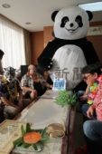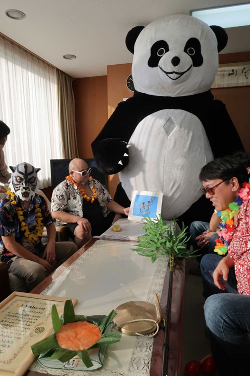 [写真/ 〝笹〟のプレゼント   パンダだけに根室の姉妹都市・富山県黒部市名物、マスを笹の葉で包んだ笹寿司(手前)が贈られた ]
