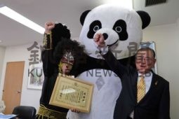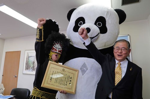 [写真/ 新根室プロレス   同団体のモットー「無理しない ケガしない 明日も仕事」で贈呈式を締めくくった石垣市長、ジャイアントパンダ、サムソン宮本代表(右から) ]