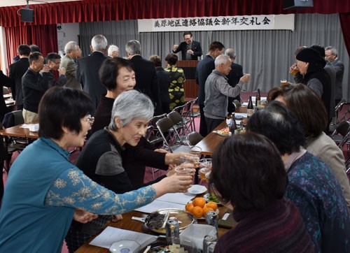 [写真/地域の発展を祈念して乾杯する出席者(美原地区連絡協議会) ]