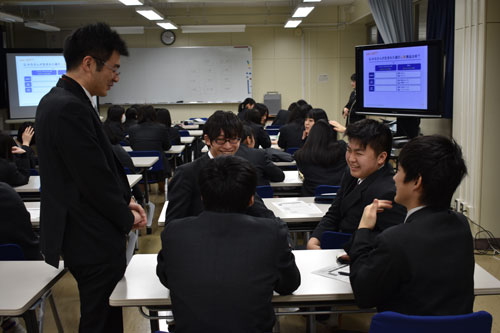 [写真/今野さん(左)からアドバイスを受け、意見を出し合う生徒 ]