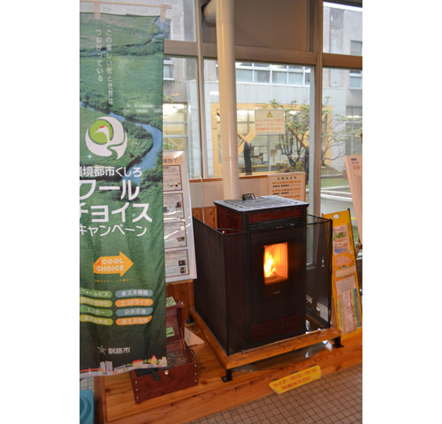 [写真/市役所本庁舎に展示されているペレットストーブ。募集件数こそ少ないが毎年必ず補助金の交付がある ]