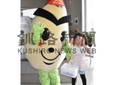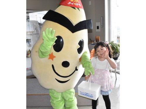[写真/ジャンケンに勝ち抜き、オーイ☆スター君からカキの詰め合わせが贈られた佐藤ほのみちゃん(右) ]