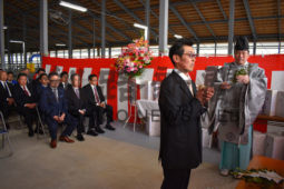 [写真/㊤AMRを見学する関係者ら㊦玉串を奉納する小林代表 ]