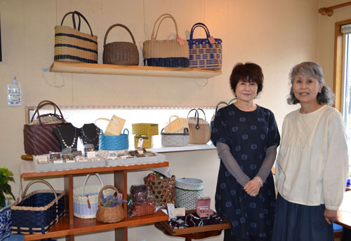 [写真/エコクラフトバッグなど作品と、左が山下さん(喫茶アロマ) ]