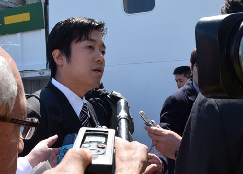 [写真/根室港帰港後、報道陣に囲まれる丸山議員 ]