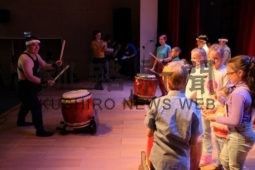 [写真/ロシア人島民に太鼓を指導するしべつとどわら太鼓保存会のメンバー(11日)=同行記者団 ]