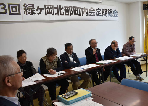 [写真/町内会事業について説明する磯部会長(右から3人目)=緑ケ岡北部町内会 ]