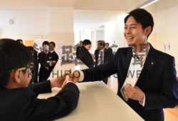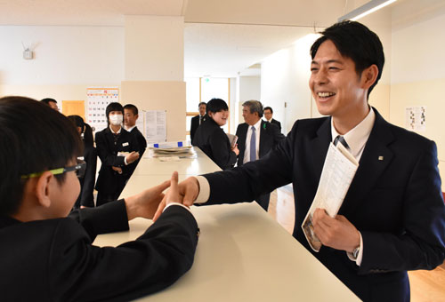 [写真/駆け寄ってきた生徒と握手する鈴木知事 ]