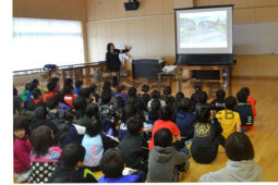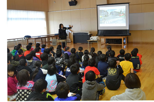 [写真/スクリーンを使って交通ルールを教える木村さん ]
