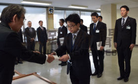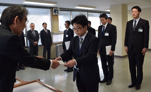[写真/蝦名市長(左)から辞令を受け取るプロジェクトメンバー ]
