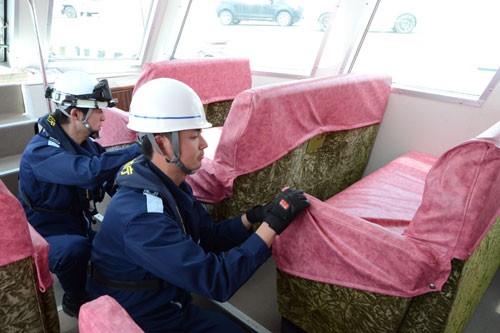 [写真/座席下の救命胴衣を点検する海保職員 ]