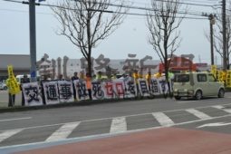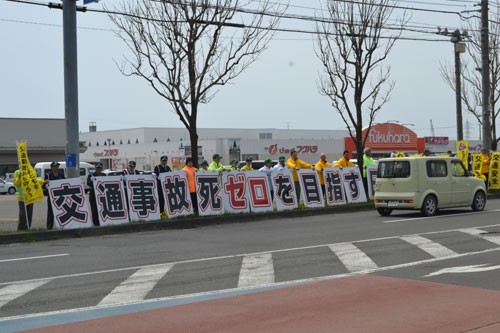 [写真/大型看板で「交通事故死ゼロの日」をアピール ]