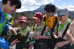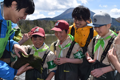 [写真/打ち上げられたマリモを間近で観察する児童ら ]