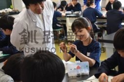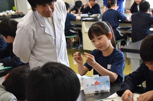 [写真/境教授の指導の下、種類の違う石を比べる児童 ]