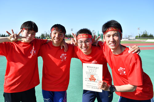 [写真/男子400㍍リレーで大会新をたたき出した釧湖陵の萩野、高橋、塚野、河野(左から) ]