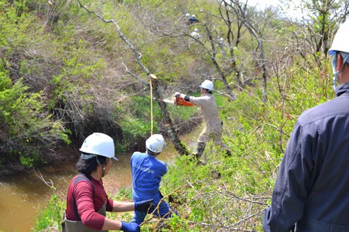 [写真/チェーンソーを使って雑木を伐採する参加者ら ]