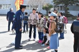 [写真/下校する児童に声を掛ける釧路署員ら ]