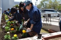 [写真/苗を植えながら交流を図る生徒たち ]