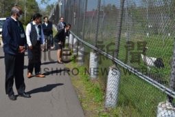 [写真/タンチョウと対面し笑顔を見せる参加者たち ]
