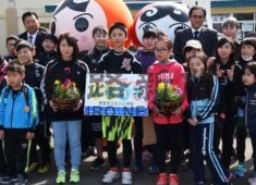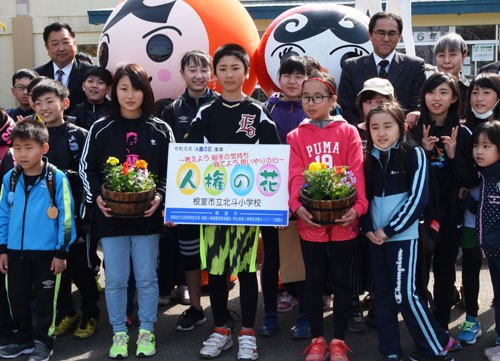 [写真/北斗小での贈呈式後の記念撮影 ]