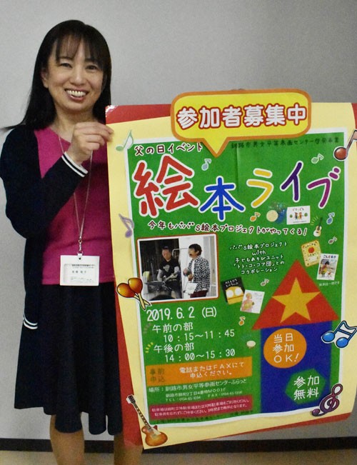 [写真/毎年好評の「絵本ライブ」の参加を呼び掛ける同センター職員 ]