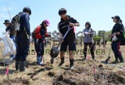 [写真/シマフクロウの生息環境復元に向けた植樹を行う参加者 ]