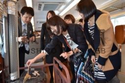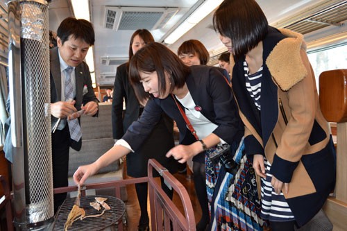 [写真/関係者向けに開催したSL冬の湿原号試乗会で、するめあぶりを楽しむ参加者 ]