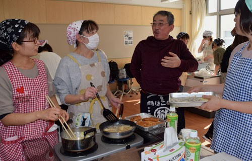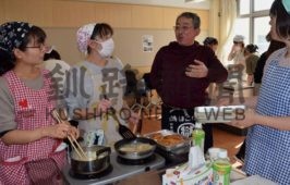 [写真/御厩敷さん(右から2人目)の指導を受けながら、和やかな雰囲気で行われた釧路おさかな教室 ]
