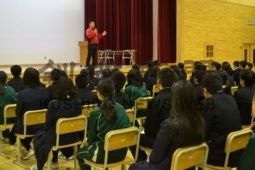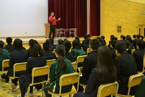 [写真/鳥取中1年の生徒を前に「どんなことでも楽しく真剣に取り組んでほしい」と話す高橋社長  ]