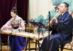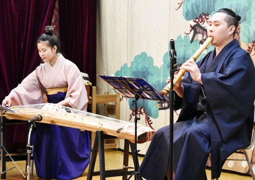 [写真/根室で習う尺八と箏の腕前を披露するクオンさん(右)とスアンさん ]