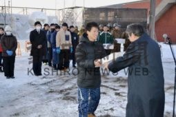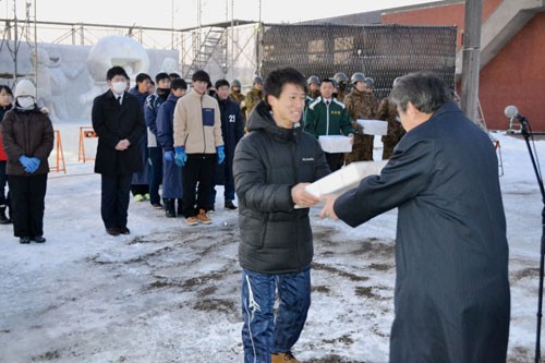 [写真/蝦名市長から差し入れを受け取る釧路北陽高校サッカー部の代表生徒 ]