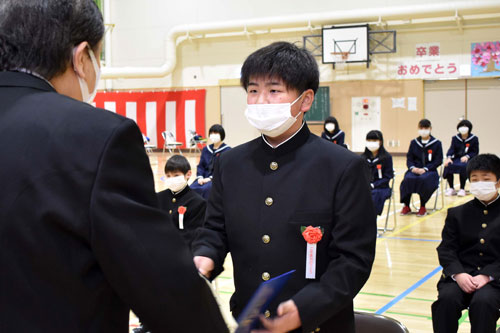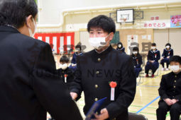 [写真/柳田校長から卒業証書を受け取る卒業生(興津小学校) ]