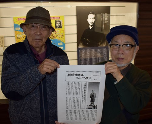 [写真/国際啄木学会釧路大会の開催を告げる「さいはて便り」を手にする北畠会長(左)と大川さん ]