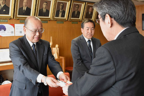 [写真/蝦名市長に目録を手渡す猿子支店長 ]
