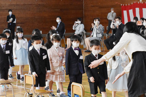 [写真/緊張した面持ちで入場する入学生(6日、朝陽小学校) ]